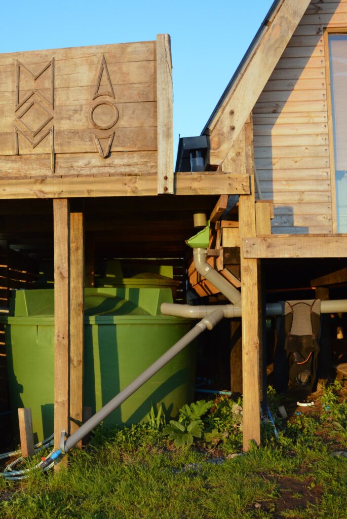 Por ahora tengo tres estanques de 5.400 litros con una capacidad de almacenamiento para almacenar aproximadamente 15.000 litros de agua de lluvia (la entrada y el rebosadero quitan parte de la capacidad de almacenamiento). Una cantidad de almacenamiento de agua necesaria considerando que esta zona es propensa a períodos prolongados de sequía. 15.000L de almacenamiento /60L de uso diario = 250 días o un mínimo de 8 meses de suministro de agua sin que haya lluvia.
